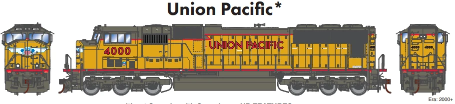 This release of UP SD70Ms depicts units from the first order, with early (non flared) SD70M bodies in their as-built appearance. For later-era operations, a consumer-applied GPS dome is included.