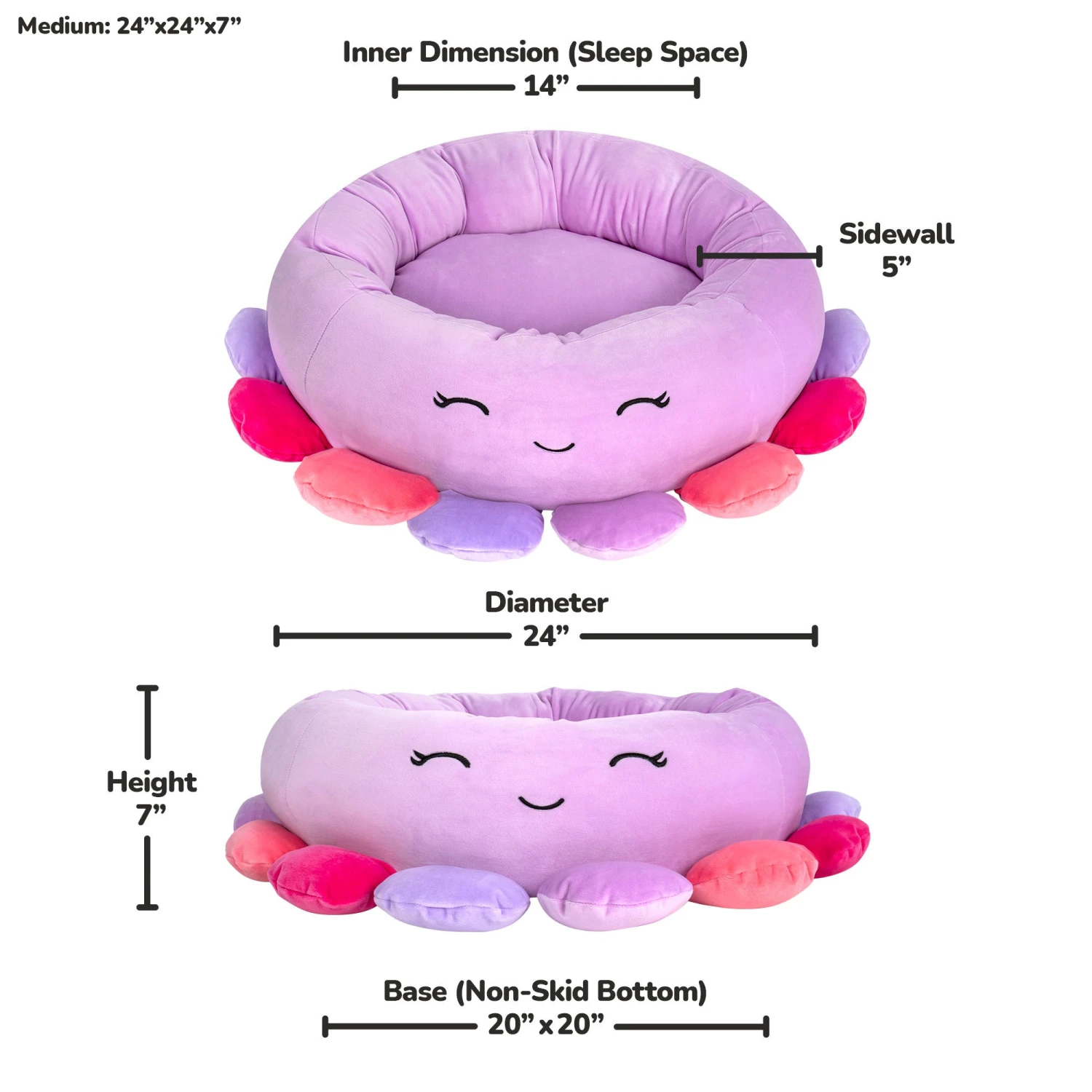 This round Squishmallows Beula octopus bolster pet bed is perfect for cuddly cats and dogs alike. Cushioned bolsters around the edges create a natural headrest and include cute Squishmallows design details. The sleeping area is stuffed with polyester-fiber filling and a unique squishy fabrication covering the outside. Authentic Squishmallows pet beds are easy to maintain, spot clean only. These loveable and snuggable Squishmallows pet beds are the softest and cutest pet beds around. Join the Squad!