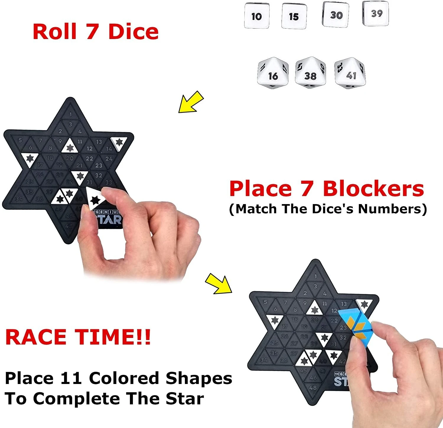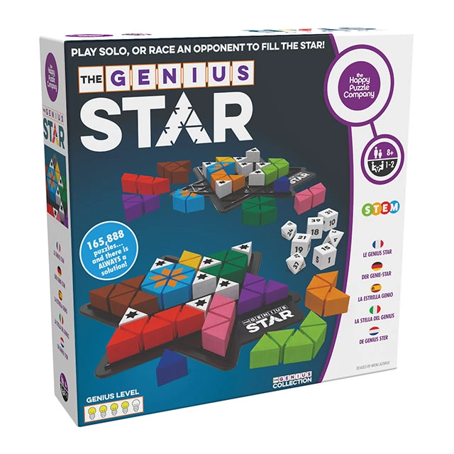 The aim of the genius family game is to fill the 11 colored shapes in the 7 positioned blockers to complete a “STAR”. There are 165,888 possible solutions in the 48 triangle spaces grid. It is the advanced version of “The Genius Square.”