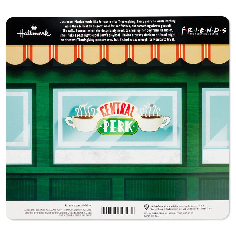 Relive all the hilarious moments from the iconic “Friends” television episode, “The One With All the Thanksgivings,” when you add this set of two itty bittys to your collection. Stylized plush versions of Joey and Monica feature the popular characters, each with a turkey on their head—and complete with a fez hat and sunglasses on Monica. Makes the perfect gift for pals who love the popular sitcom.