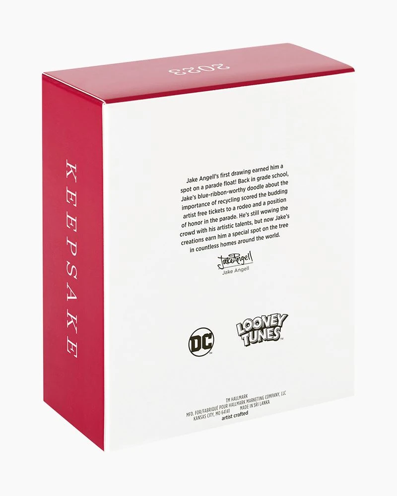 Celebrate 100 years of storytelling from the Warner Bros. studios with these fun Christmas tree ornaments. While Batman may have his Robin, that doesn’t mean Wile E. Coyote will end up with his Road Runner – but that never seems to stop the coyote from scheming! Hang this set of two Looney Tunes decorations featuring the conniving canine disguised as the Caped Crusader and an iconic ACME Products shipping box to bring a Super Hero-sized smile to any holiday decor.