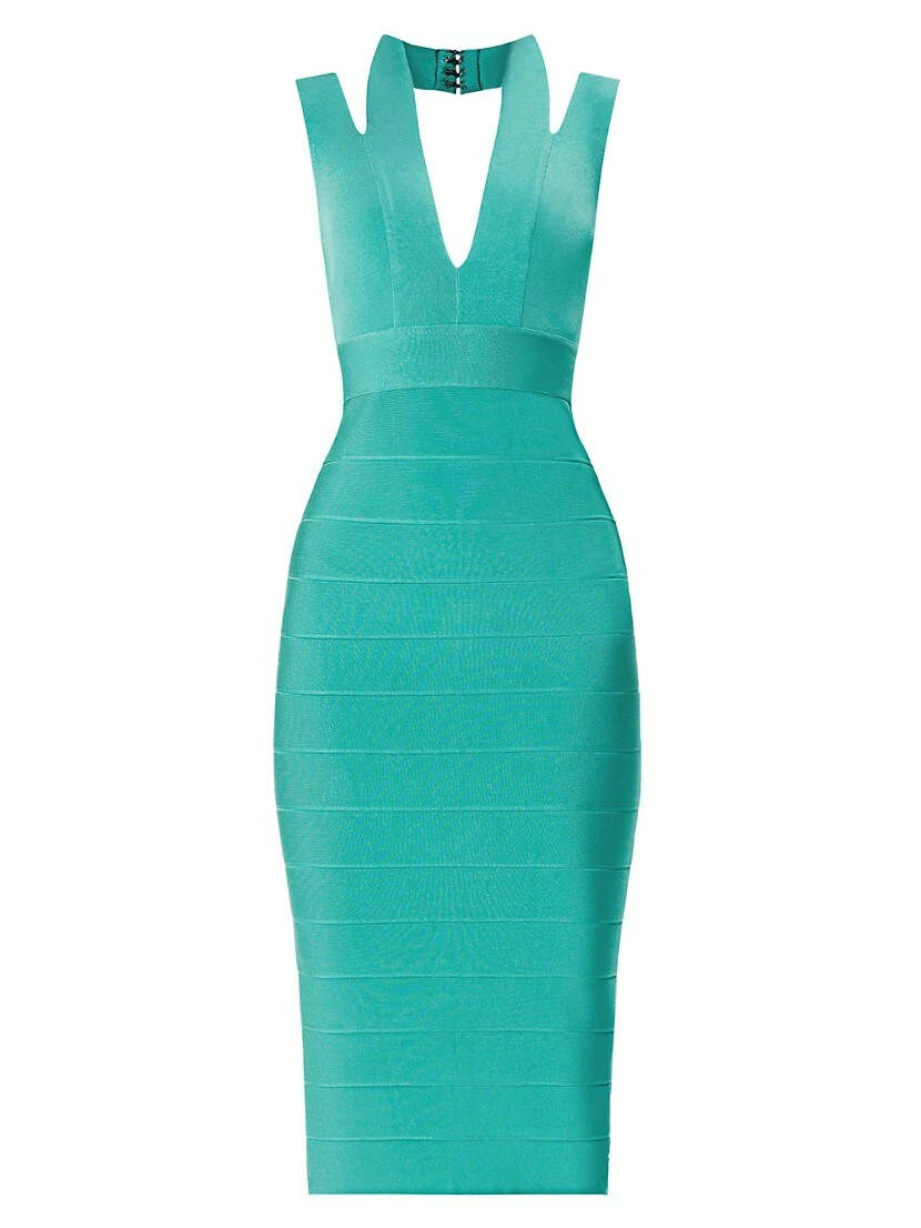 Hervé Léger’s bandage-style sheath dress skims the figure in a body-con design. Cut with a sharp V-neck, this strappy style features cut-outs at the shoulders.