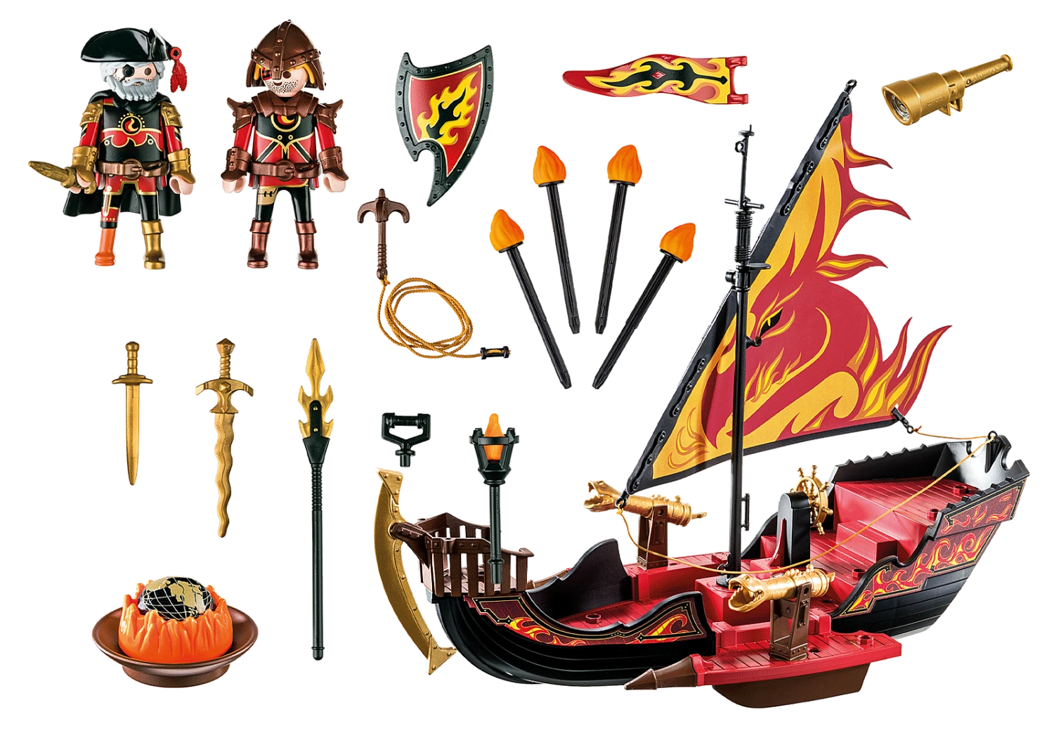 The quest for the magical armour Invincibus continues. But the adventure does not only take place on the mainland. Even on the water the Burnham Raiders are a burning threat with their multi-functional fire ship. If an enemy approaches, the cannons are brought into position at lightning speed. As soon as the ship gets close enough, the Raiders extend their prow and use it as a grappling hook. Hot-headed Bayron Burnham is in charge aboard the ship. Right now, the pyromaniac warlord is studying the magical compass to learn the coordinates of the Invincibus. Will the compass lead the Burnham Raiders to its destination? Set includes the leader of the Burnham Raiders Bayron Burnham and Archibald Blazebow, a fire ship with working cannons, dragon sails and a magic compass. The sickle on the bow of the ship can be used either as a ram guard or as a grappling hook. The ship can be upgraded with an underwater motor (7350).