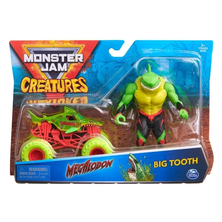 - A NEW WAY TO PLAY: Play with your Monster Jam trucks in a whole new way! This set comes with a 1:64 scale Megalodon and Big Tooth action figure – both highly detailed and full of attitude!